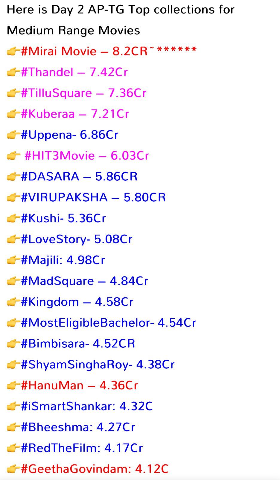 బాక్స్ ఆఫీస్ వద్ద తేజ సజ్జా హీరోగా నటించిన మిరాయ్ సినిమా సెన్సేషన్ క్రియేట్ చేస్తోంది. మిడ్ రేంజ్ సినిమాల విషయంలో, అలాగే టైర్ 2 హీరోల విషయంలో సెకండ్ డే ఇండస్ట్రీ ఆల్ టైమ్ రికార్డ్ను మిరాయ్ సినిమా బద్దలు కొట్టింది. తెలుగు స్టేట్స్ కలెక్షన్స్ విషయంలో 8 కోట్ల 20 లక్షల షేర్తో ఇండస్ట్రీ రికార్డ్ సృష్టించాడు. టైర్ 2 హీరోలుగా ఉన్న నాని హిట్ 3, శ్యామ్ సింగరాయ్, దసరా, విజయ్ దేవరకొండ ఖుషి, కింగ్డమ్, గీత గోవిందం సహా నాగ చైతన్య తండేల్, లవ్ స్టోరీ, మజిలీ వంటి సినిమాల రికార్డులను కూడా ఈ సినిమా క్రాస్ చేసింది. రెండవ రోజు తెలుగు స్టేట్స్లో మీడియం రేంజ్ సినిమాలలో హైయెస్ట్ షేర్ వచ్చిన సినిమాగా టాలీవుడ్ చరిత్రలోనే మిరాయ్ ఒక రికార్డు క్రియేట్ చేసింది. ఈ సినిమాలో తేజ సజ్జా నటనకు విమర్శకుల ప్రశంసలు దక్కుతున్నాయి. ముఖ్యంగా యాక్షన్ సీన్స్లో తేజ డూప్ లేకుండా అద్భుతంగా పెర్ఫార్మ్ చేయడంతో పాటు మనోడి కామెడీ టైమింగ్ సినిమాకి బాగా వర్కౌట్ అయింది. అన్ని భాషల్లోనూ తేజ పర్ఫామెన్స్కు యునానిమస్ పాజిటివ్ రిపోర్ట్స్ దక్కుతున్నాయి. ఇక ఈ దెబ్బతో టైర్ 2 హీరోలలో తేజ సజ్జా టాప్ లీగ్లోకి వచ్చినట్లుగానే ట్రేడ్ వర్గాల వారు విశ్లేషిస్తున్నారు. కార్తీక్ ఘట్టమనేని డైరెక్టు చేసిన ఈ సినిమాని పీపుల్ మీడియా ఫ్యాక్టరీ బ్యానర్ మీద టీజీ విశ్వప్రసాద్ అత్యంత ప్రతిష్టాత్మకంగా నిర్మించారు. రితిక నాయక్ హీరోయిన్ గా నటించిన ఈ సినిమాలో శ్రియ జగపతిబాబు ఇతర కీలక పాత్రలలో నటించారు. మంచు మనోజ్ విలన్ పాత్రలో నటించారు.