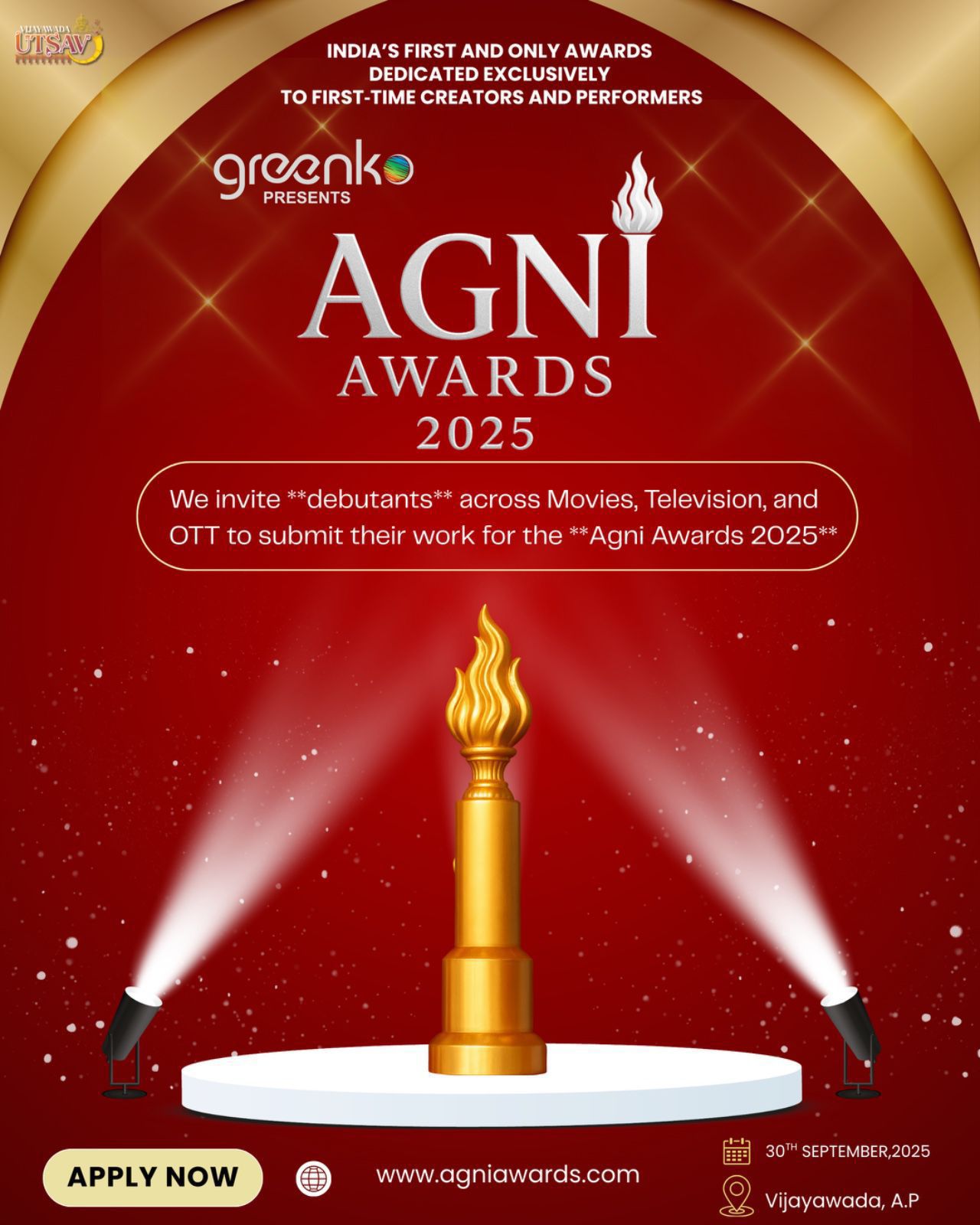 అవార్డ్స్ ఇచ్చే సంస్థలు కొత్త వారికోసం ఒకటో రెండో కేటగిరీలు పెడుతుంటాయి. కానీ కొత్తవారి ప్రతిభను ప్రోత్సహించేందుకే ఎక్సిక్లూజివ్ గా పురస్కారాలు ఇవ్వబోతోంది “అగ్ని అవార్డ్స్ 2025”. ఇండియాలో తొలిసారి సినిమా, టీవీ, ఓటీటీల్లో ప్రతిభ చూపించిన న్యూ టాలెంట్ కు గుర్తింపు ఇస్తూ వారికి “అగ్ని అవార్డ్స్ 2025” అందించనున్నారు. ఈ నెల 30న విజయవాడలో జరగనున్న ప్రతిష్టాత్మక విజయవాడ ఉత్సవ్ లో ఈ అవార్డ్స్ ఈవెంట్ నిర్వహించబోతున్నారు.